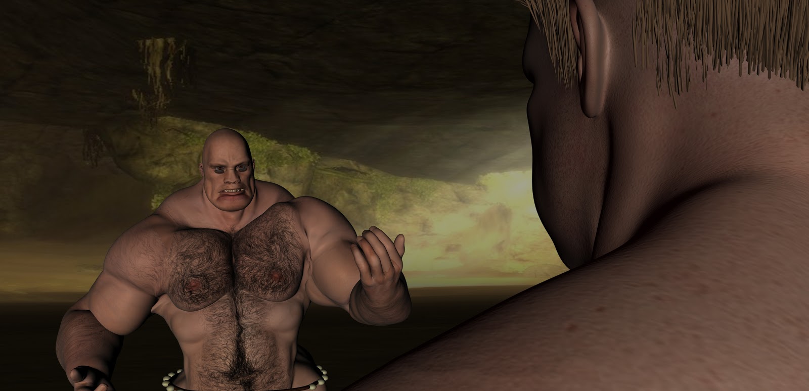 Before the Man-Ape could make good on its vile intentions, the Mule began to awaken. His chest spasmed as he coughed, raising his head and opening his bleary eyes. Upon coming to and seeing the Man-Ape's intention, he clumsily rolled and climbed to his feet. He then proceeded to struggle to find his footing as the cave spun around him. He growled like a bear and shook his head a few times to clear it. Finally, the 'three' Hurillas focused into one, and he clearly saw what had happened. The Mule spit out a mouth of blood and then wiped the blood from his lips. The thought that he had been knocked out YET AGAIN, by an damn filthy ape angered him and the thought that the ape had intended to fuck him just pushed Mule over the edge. With a primal scream. Mule flexed at his half human opponent, letting his physique do the talking for him. It seemed to The Mule that it had worked, as the Man-Ape took a step back before focusing his eyes on the Mule's crotch. It was clear that The Mule put his humanoid opponent to shame.