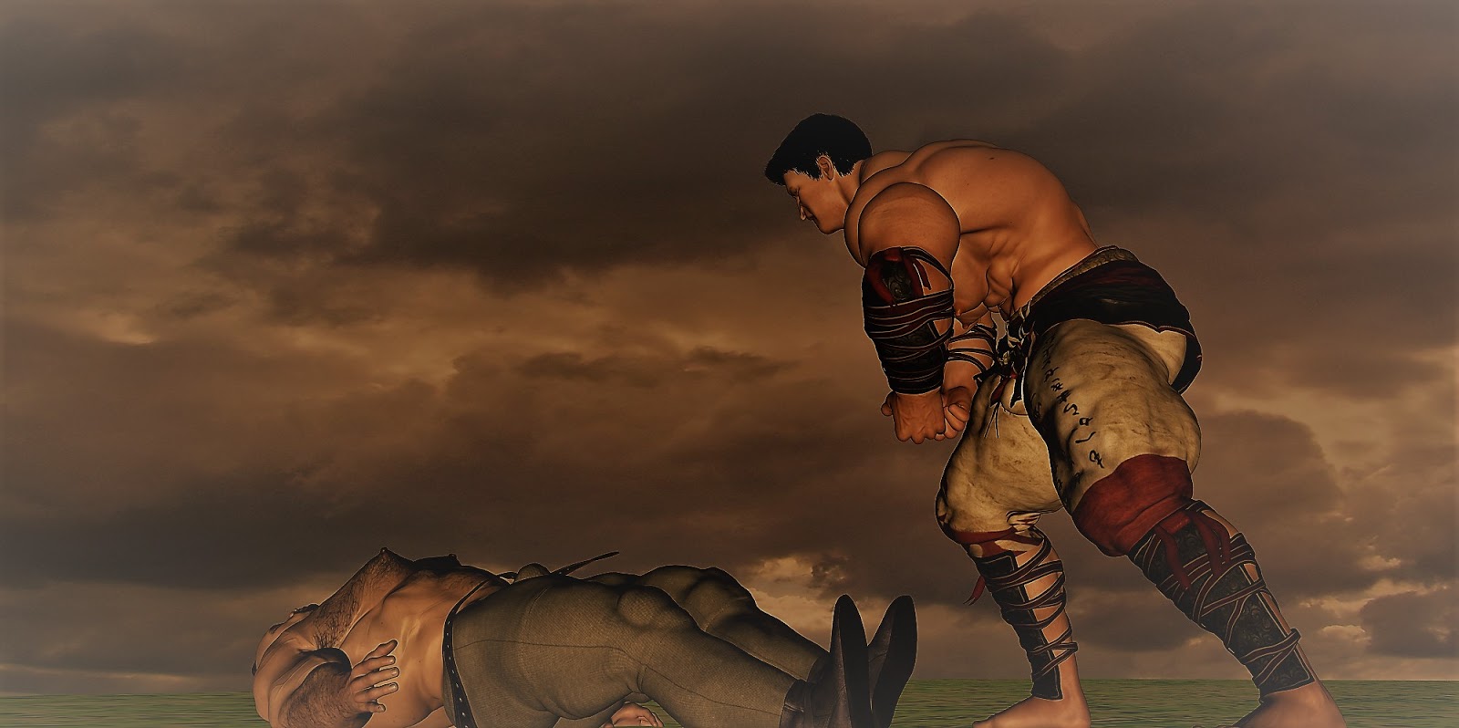 Caught in the moment of the idolization of the crowd’s worship, Jamukha continued to showboat by constantly posing his massive, musclebound body to their roaring delight, giving Muleghis time to recover. With Jamukha’s back turned away from him, he clumsily got to his feet. For a few seconds he staggered about until once again uncontrollable rage took hold of Muleghis. He clinched his fist as tight as he could, to summon all his might. His body shook with the wrath of vengeance as every muscle flexed to their maximum size. Blood rushed to his muscles. He felt reinvigorated, and powerfully strong. Like a giant ape gone berserk, he let out a great roar.